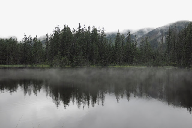 Doszłam do końca Kościeliskiej i zaczęłam wspinać się do Smreczyńskiego Stawu. Na szlaku nie było nikogo poza mną. Cały czas strasznie lało. Plusem tej sytuacji był fakt, że szeleszcząca wokół mojej głowy peleryna zagłuszała wszelkie podejrzane dźwięki typu ryki z lasu;> Doszłam do Smreczyńskiego, a tam oczywiście pusto. Bardzo dawno temu uciekałam stamtąd przed rykami:> Tym razem było słychać tylko chlupanie deszczu.