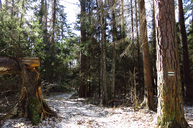 Kawałek trzeba było przejść szosą, potem zielony zakręcał w las na południe od jezdni.