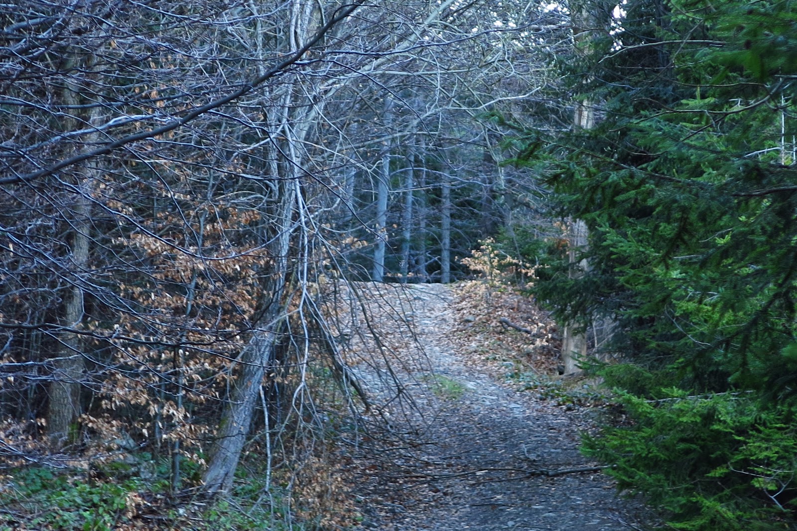 Droga weszła w las. Ta trasa nie obfitowała w przysiółki. One są zazwyczaj na położonych bardziej na północ szlakach Beskidu Wyspowego, część południowa jest zdecydowanie bardziej dzika, zalesiona, a szlaki często trudniejsze. Czasem zaskakująco trudne, jak żółty na Luboń Wielki czy czarny na Szczebel, ale o tym dopiero w relacji z majowej trasy.